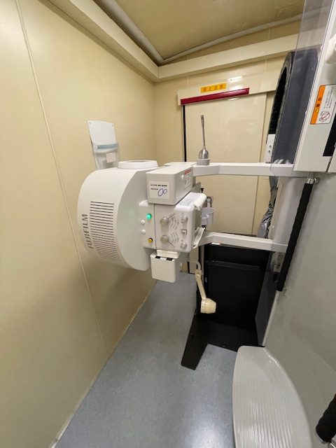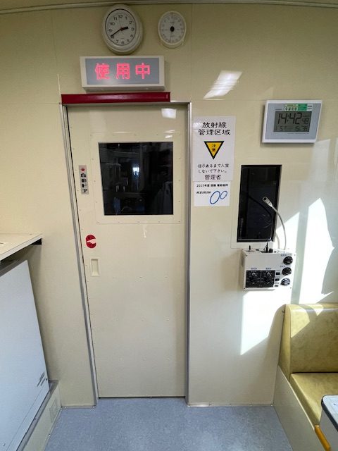 本事業では検診車搭載の胃部X線装置を最新型へ載せ替え整備を行い、今まで以上に検査画像の高画質化と被ばく量の低減化を実現し、併せて画像処理の速度も向上した事により短時間でより多くの方々の受診が可能となっております。また、従来装置と比べてコンパクトな形状になっており検診車内の待合室を拡張でき、広いスペースで安心して検査をお待ちいただけます。